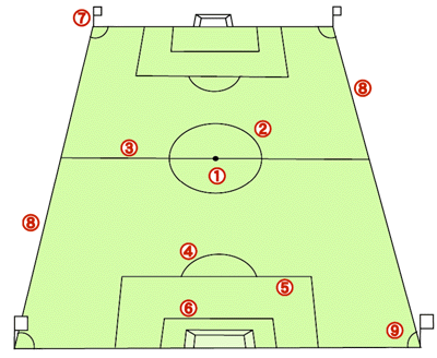 ピッチという言葉を良く聞きますが グラウンドと何がちがうの? 日本代表を選考している頃も 「ピッチに立てるように頑張ります」 なんて発言をよく聞きました。 ピッチとは タッチラインとゴールラインに 囲まれた部分をいいます。 ということは「ピッチ」にたつ=試合に出場する ってことをさします。 補欠で試合に出れないままだとピッチには立てないもんね。 何?タッチラインもゴールラインもわからない? それじゃ、これを機会にピッチ用語を覚えておきましょう。 こいつを知っていると ルールを理解する手助けにもなるし 実況解説もすんなりと耳に入ってくるし 通同士の会話にもすんなり参加できるかも。 それでは下の図を参照にしてくださいね。 ![]() 1:センターマーク ここにボールをおいてキックオフです。 点をとった場合はとられた側のキックオフで ここからゲーム再開ですよ。 2:センターサークル キックオフの際、相手の選手達は 攻撃側の選手がボールに触るまではこの中に入れないのですよ。 3:ハーフウエーライン このラインを境に自陣、敵陣を判断します。 4:ペナルティーアーク ペナルティーキックの時はキッカー以外の選手は内側に 入れないのです。 5:ペナルティーエリア このエリア内ではゴールキーパーは手を使うことができます。 このエリア内で守備側が反則を犯すと ペナルティーキックとなります。 6:ゴールエリア ゴールラインから出たボールに攻撃側が最後に触った場合、 守備側にゴールキックが与えられる。 ゴールエリア内ならどこからでもキックが出来ます。 7:ゴールライン このラインから出たボールに最後に守備側が触った場合は コーナーキックに。 攻撃側が最後に触った場合はゴールキックになります。 8:タッチライン このラインからボールが出た場合、 最後に触ったチームの相手側のスローインでプレーを再開します。 (スローインにはこのような決まりがあります。 ・両手を使うこと ・フィールドに面していること ・両足ともその一部をタッチライン上または タッチラインの外のグラウンドにつけている ・頭の後方から頭上を通してボールを投げる 以上に当てはまらない場合はファールスローとして 相手側のスローインになります。) 9:コーナーフラッグポスト ゴールラインから出たボールが守備側が最後に触った場合 ここからコーナーキックを蹴ります。 これからチュニジア戦に向けて フル回転だよ!ぃよろしくっ!
