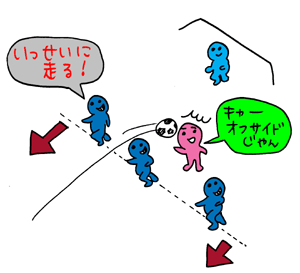 日本代表、今回のワールドカップで 思っていた以上の活躍を見せてくれましたね。 日本の選手といえば、大会前は 「ナカタ」「ゴン」しか知らなかったわたくしですが、 森島、柳沢、稲本など、いろんな選手の名前を覚えました。 そして、それぞれの選手がそれぞれの役割を きちんと果たして、みごとなプレーを見せてくれました。 日本のプレースタイルに学ぶこと、けっこう多かったぁ、 と思っています。 さて、先日このページで フラット3ってなぁに? と、呼びかけましたところ、 みなさまよりたくさんのメールをいただきました。 ありがとうございました! ふむふむ、フラット3を語りたい人は 日本中にたくさんいらっしゃったようだ! そのうちの、いくつかをご紹介させていただきます。 フラット3(ふらっと・すりー、と読みます)は、つまり、 ディフェンスの方法のことです。 サッカーの守りには、大きくわけて、 スリーバック(3人のディフェンス)と フォーバック(4人のディフェンス)があります。 日本は3人で、スリーバックです。 (こう書くと、フォーバックの方が人数が多そうですが、 実は逆なんです。 フォーバックのうちのふたりはそれぞれの端を守ります。 だから、中央を守るのはふたり。 スリーバックの場合も端を守る人はいますが、 何故かその人はミッドフィルダーに 数えられるようです。) そして、スリーバックの場合は、 ふつうはふたりがやや前にいて 相手のフォワード(いちばん前の選手で、普通はふたり)を マークし、あとひとりがその後ろに 「保険として」残っているのが普通です。 しかし、トルシエジャパンの場合は、 3人が横一線 (フラット・平面上)に並ぶ システムなのです。 フラットなスリーバックだから 「フラットスリー」なんですね。 (たまたまさん) なるほどなるほど。 フラット3は、3人でディフェンスをする 守りのシステムなんですね。 で、トルシエさんの「フラット3」は 横一列に並んでることが特徴なわけだ。 フラット3は、ディフェンダー(防御)3人が 横一列に並んで、ディフェンスのラインをコントロールし、 相手のオフサイドを誘うシステムです。 マンツーマンでは封じきれない世界の強豪に対抗するため、 トルシエ監督が導入した日本代表の戦術の柱なのです。 (Nさん) 相手のオフサイドを誘えるから、 フラットにしているのだ、と。 フラット3! トルシエさんが大好きなふらっと3! 通常は4バックなど、ゴールキーパーの前に 「スイーパー」と呼ばれる人が守りますが フラット3はそれがありません。 このフラット3は相手にオフサイドトラップを かけやすいんです。 日本代表の試合でも3人が手を上げて キーパーとは反対のほうに走っているようすを よく見ませんでしたか? あれはオフサイドトラップをかけようとしてるんです。 (くりこさん) ![]() ディフェンダーが3人、ゴール前を防御する。 ![]() 3人が全員、ゴールよりわざと離れて、 パスをもらいそうな敵の選手を置き去りにして オフサイドにする。 これを「オフサイド・トラップ」という (たまたまさん) ただしこのフラット3、 サイドを崩されたり、ドリブルで突破されると、 カバーが薄くなるのが弱点。 ワールドカップ本大会前の試合では、海外の選手に その弱点をまんまと突かれることが多々見られました。 (おもしろ兄弟 兄さん) そうか、ゴールキーパーの前には、 3人しかいないんですものね。 フラット3にはディフェンダーひとりひとりの 守備力の高さが要求されます。 そのなかでも真ん中(センターバック)の人は ほかの比ではありません。 オフサイドトラップをかけるために 3人に統率が必要なのです。 フラットスリーの申し子森岡選手、 そして、宮本選手・・・。 すごいんですよ・・・。 (くりこさん) フラットスリーというのは、 ひとりが余る「スリーバック」の利点と、 オフサイドを取りやすい 「フォーバック」の利点を併せ持つ 新しい守りのシステム、というわけです。 でも、使いこなすのが難しく、 もちろん弱点もあるので そこをつかれたときの対応をどうするか、 という問題もあります。 ロシア戦では、日本はこの難しい課題をみごとにこなして 0点に抑えましたね! 森岡選手の怪我で急遽出番が回ってきて、 このシステムを中心でコントロールした宮本選手は、 ヨーロッパのメディアでは高く評価されたそうですよ。 (たまたまさん) ディフェンダー3人がトラップになるフラット3。 これに象徴されるように、今回のトルシエ采配には 注目すべき点がたくさんあったのですね〜!!