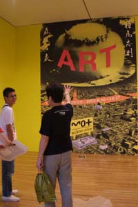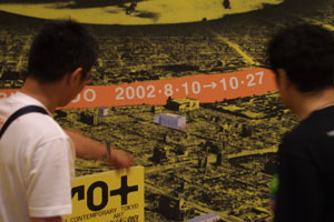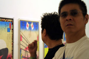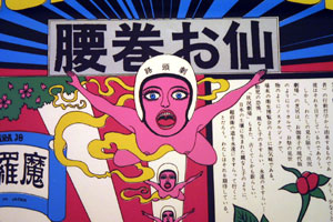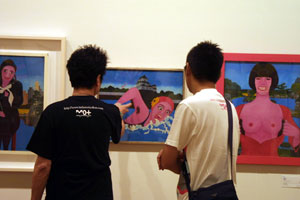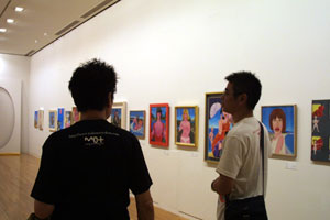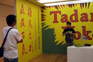 「イントロダクション」の部屋【その1】 横尾学芸員のご案内、 はじまりはじまりです。 いよいよ今日(8月10日)から東京都現代美術館で 開催される「横尾忠則 森羅万象」展。 聞き役・darlingを会場入口で迎えてくださった横尾さん、 darlingを連れて、展覧会全体のイントロダクションとなる 第一室へと向かいました。 ちょっと不思議な構造ですが、 これから行かれるみなさまにご注意。 展覧会の第一室は、3Fです。 1F入り口を入ったら、 正面のエスカレータにのって、 まっすぐ3Fにむかってくださいね。